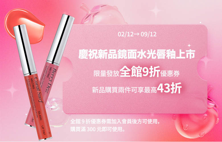 至2025-12-09T16:00:00.000+00:00截止 指定商品,鏡面水光唇釉 任選2件 $169